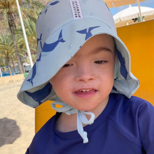 Geggamoja ® Sun Hat BLUE WHALES, in Soft Bamboo/Organic Cotton
