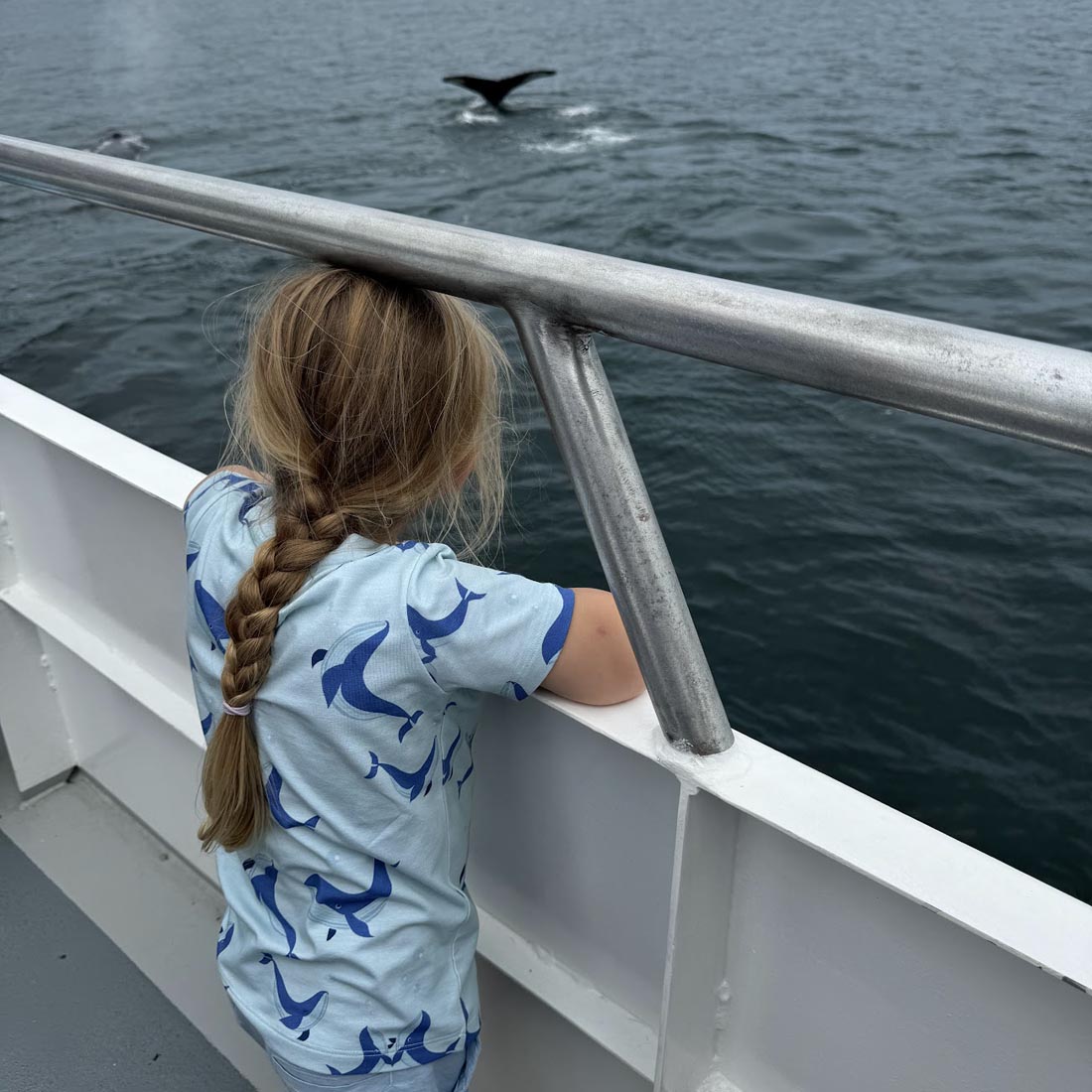 Short-sleeve T-shirt in 67% Bamboo/ 27% Organic Cotton/ 6% Elastane, with dancing blue whales on light blue background.