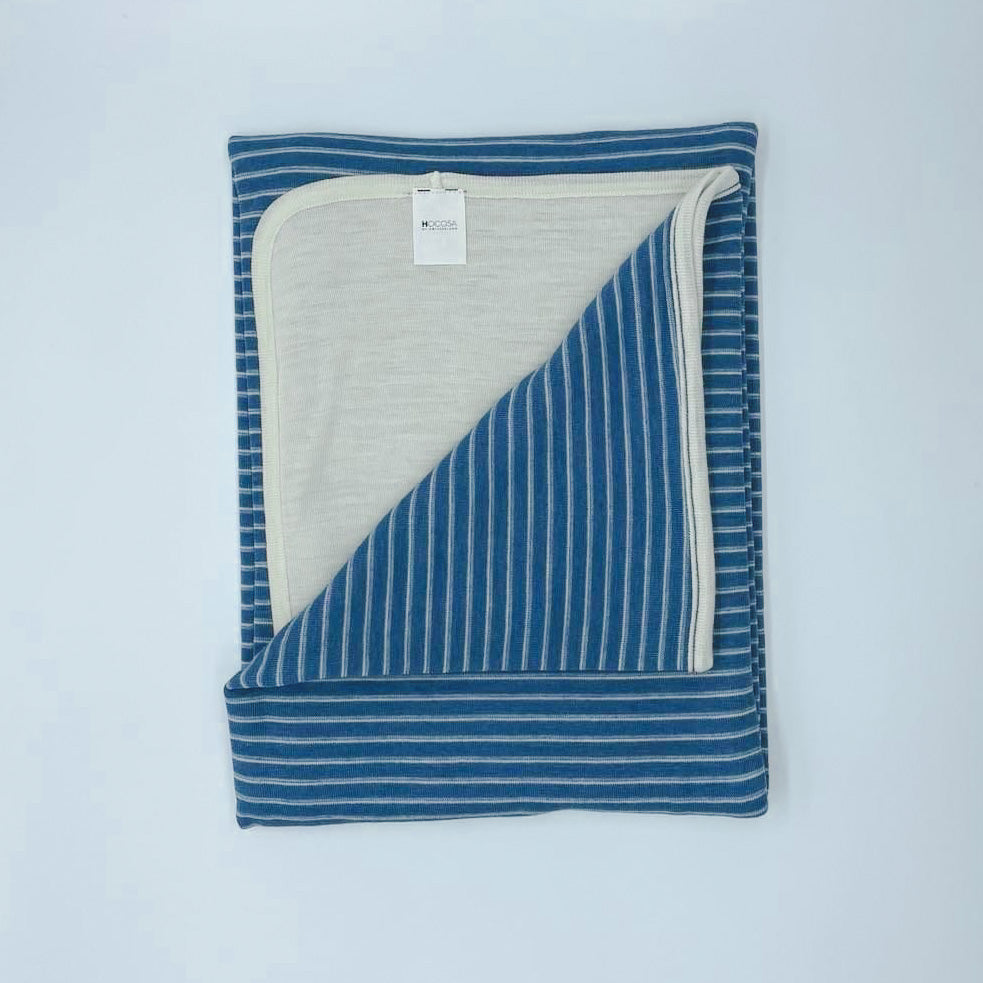 Double-layer snuggling blanket in soft GOTS-certified 100% organic merino wool. Blue/white striped on one side, solid natural white on other side.