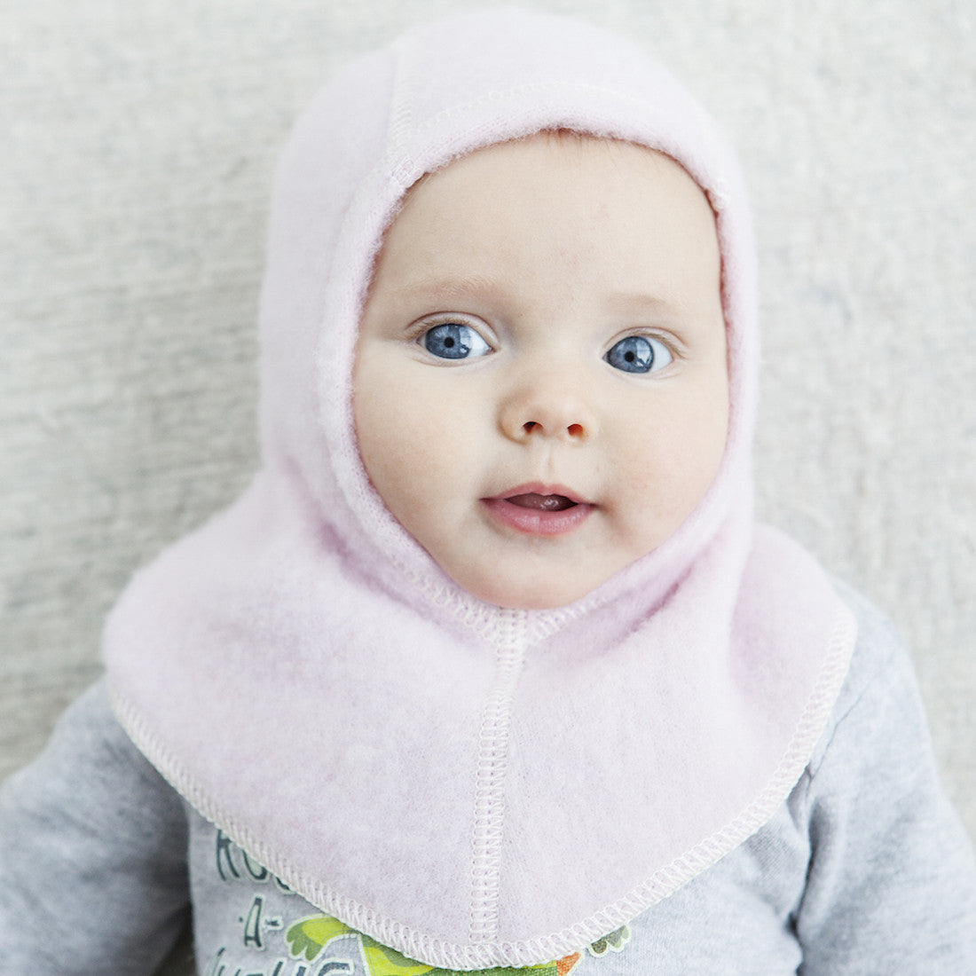Balaclava in single-layer of soothingly soft organic merino wool. Pulls easily over baby's head. Fits snugly to protect ears and neck from wind and cold.